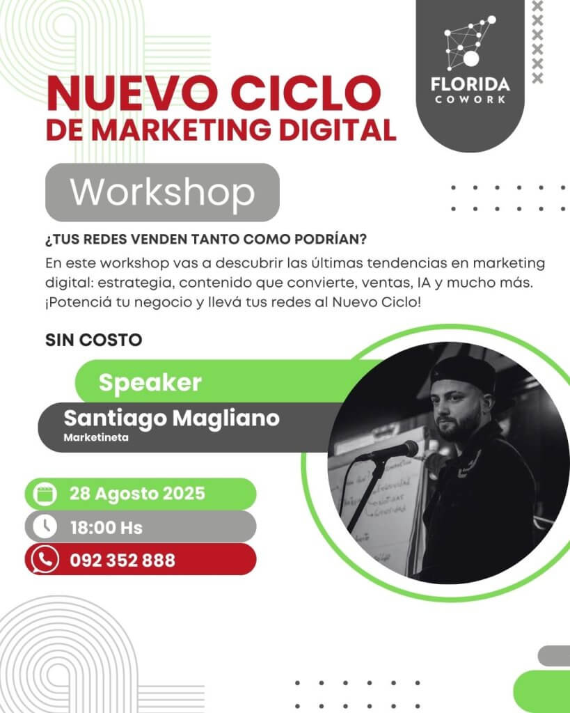 Te invitamos al Workshop “Nuevo Ciclo de Marketing Digital”, un encuentro pensado para empresas y emprendedores que quieren vender más y mejor usando las últimas tendencias. Vamos a hablar de estrategia de redes, creación de contenido que atrae y convierte, técnicas de ventas, uso de la inteligencia artificial y mucho más para que lleves tu marca al siguiente nivel.